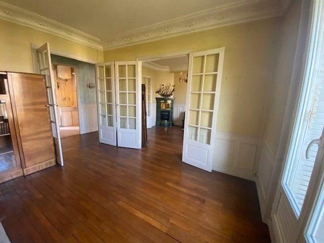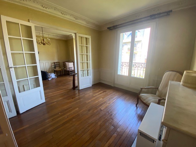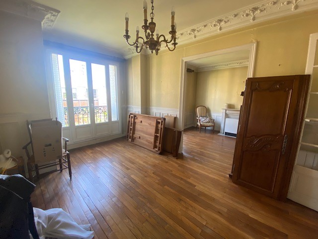 Cet appartement comprend : une entrée (6,93 m²) desservant un salon (15,02 m²) et une salle à manger (12,72 m²) sur rue avec un balcon (2,20 m²) et donnant sur cour une cuisine (5,89 m²) avec un balconnet, 2 chambres (12,80 m² et 10,72 m²), dégagement et placard. Parquet, moulures, cheminées.
